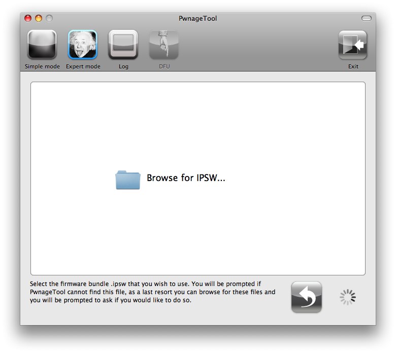 Click the blue arrow button to continue. You will be brought to the "Browse for IPSW" page. On my laptop, it automatically found the IPSW. If PwnageTool doesn't automatically find the ipsw file you can click Browse for IPSW....