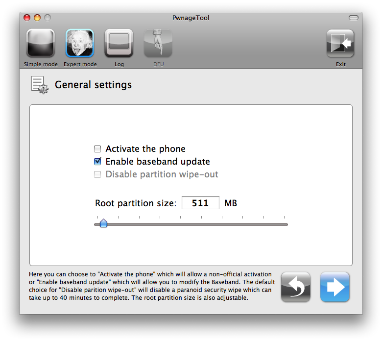 The General settings allows you to decide the partition size. Click activate the phone and Disable partition wipe-out. Click the blue arrow button.