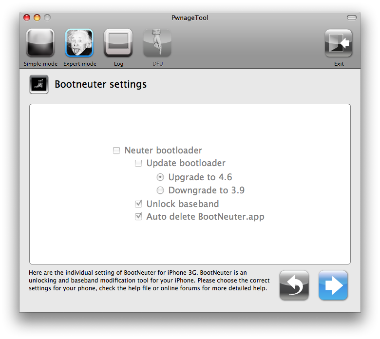 The Bootneuter settings are greyed out for the 3G iPhone. Click the blue arrow button.