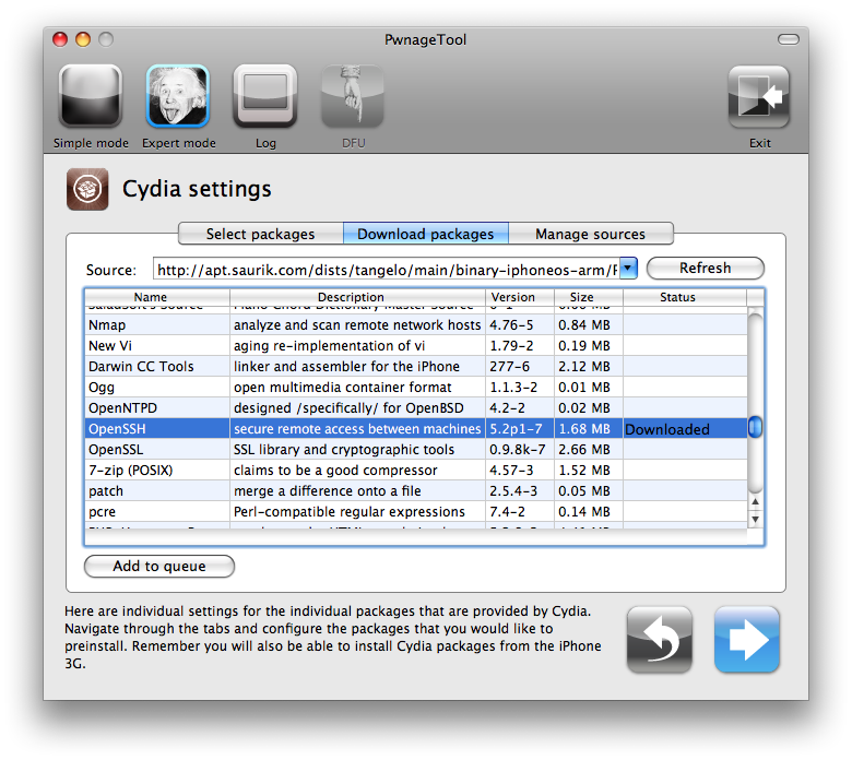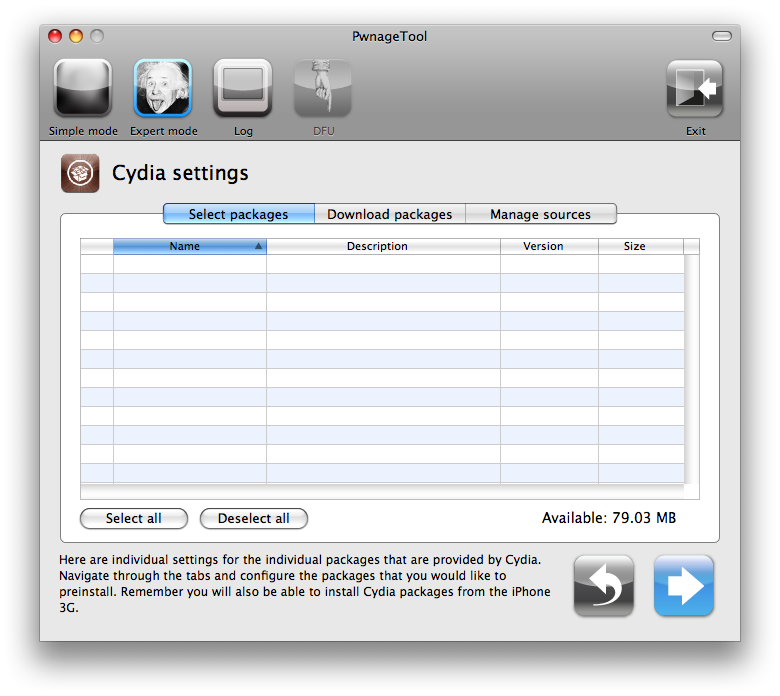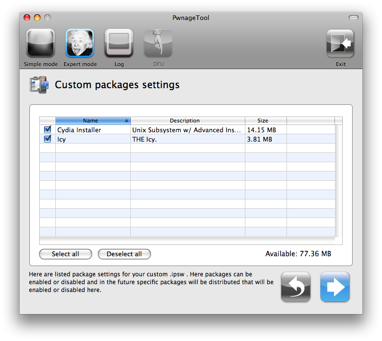 The Custom Packages Settings menu displays listed package settings for your custom IPSW. For know leave these settings as is. Click the blue arrow button to continue.