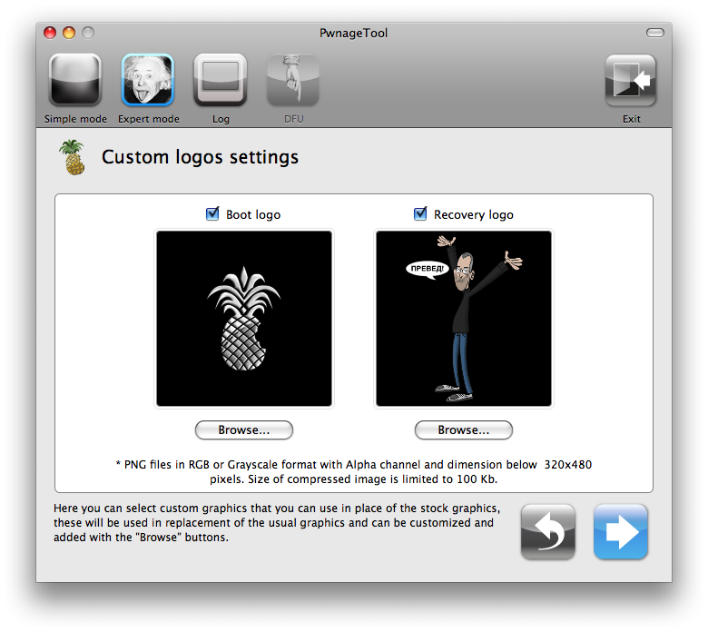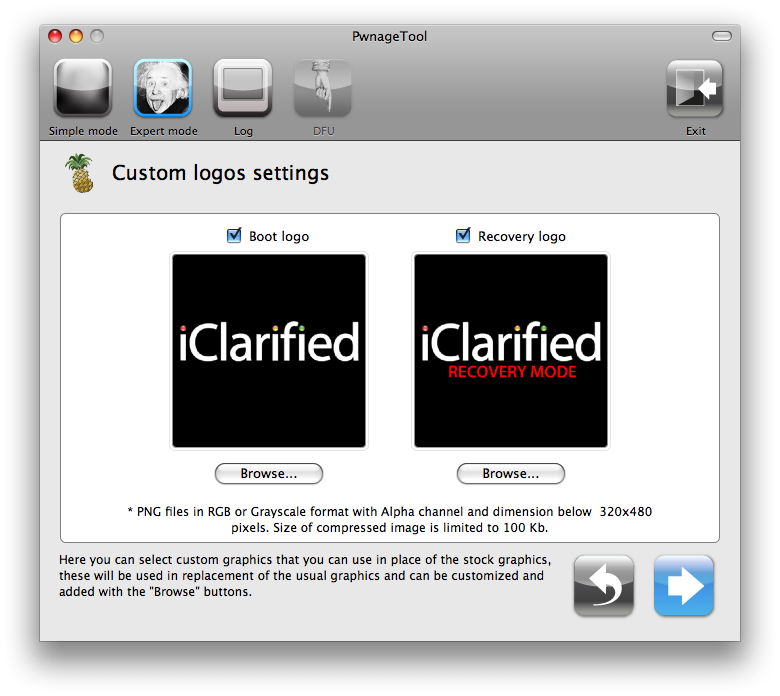 The Custom Logos Settings menu allows you to add your own images as boot logos. Click the Browse button to select your Boot logo and Recovery logo. If you would like to use the iClarified ones they can be found here: Boot Logo, Recovery Logo