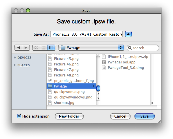 You will be asked to save your custom .ipsw file. Save it to your Pwnage folder you created on your Desktop.
