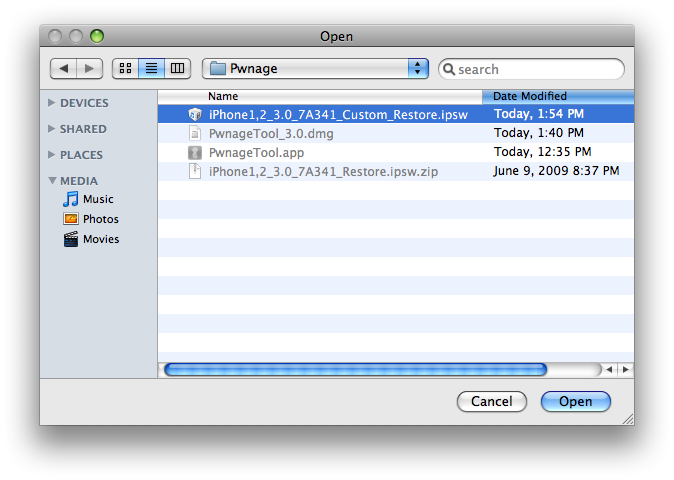 Navigate to the Pwnage folder on your desktop using the dialog window that appears. Select the custom IPSW that was created (iPhone1,2_3.0_7A341_Custom_Restore.ipsw) and click the Open button.