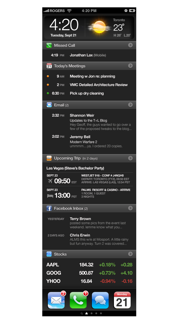 You can see from the screens it’s essentially just a scrollable list of applications and notifications. We envision it behaving in much the same way that the list view does in the Calendar application. By default it may track things like missed calls, unread emails and calendar events. But what if users could allow other apps to feed into this screen as well? If I’m a Facebook junkie I’d be able to tell the Facebook app to include certain feeds on my home screen. If I was a frequent traveler I may include the Tripit app to show me my upcoming trips. The options would only be limited by what apps you have installed.